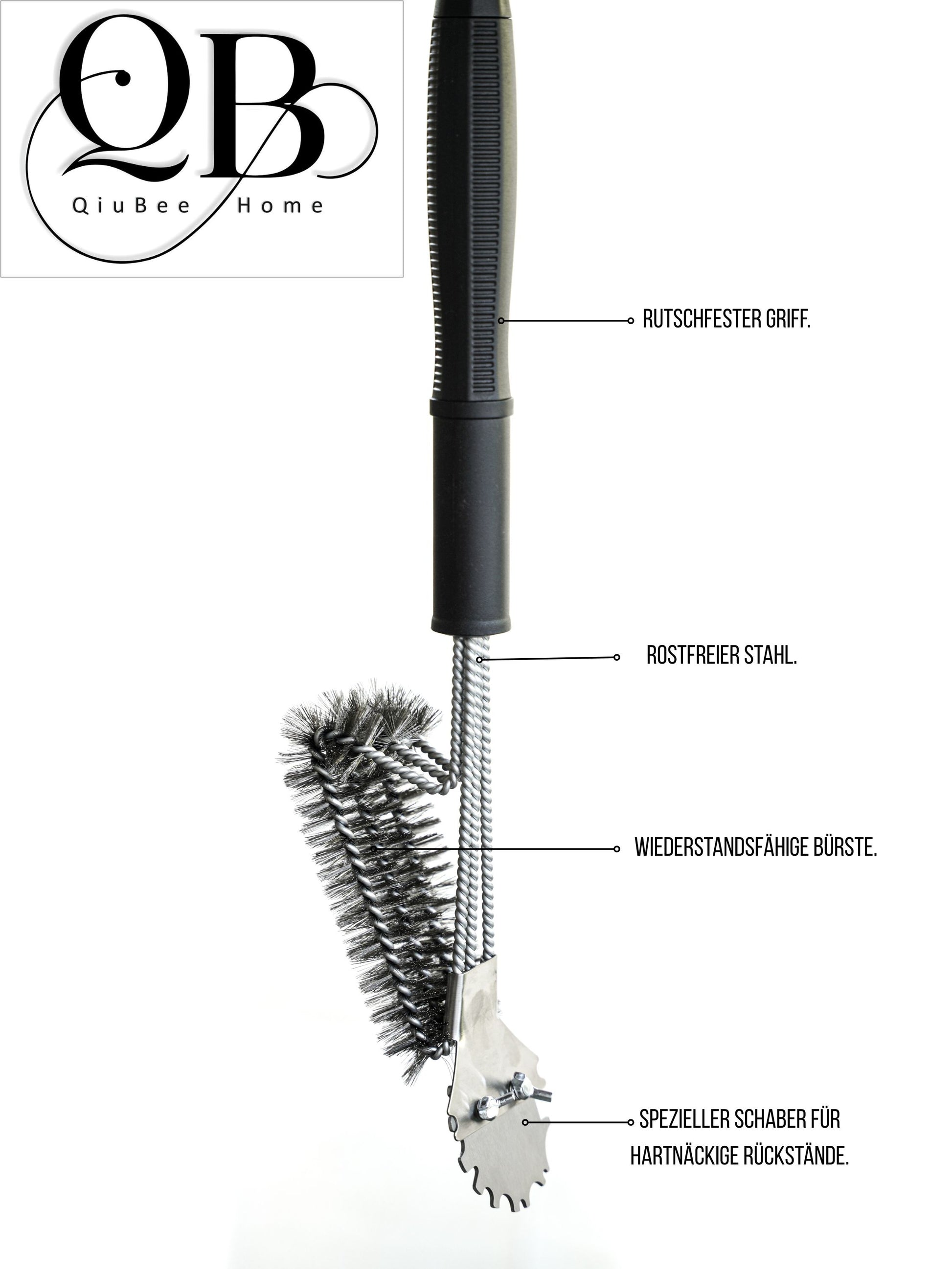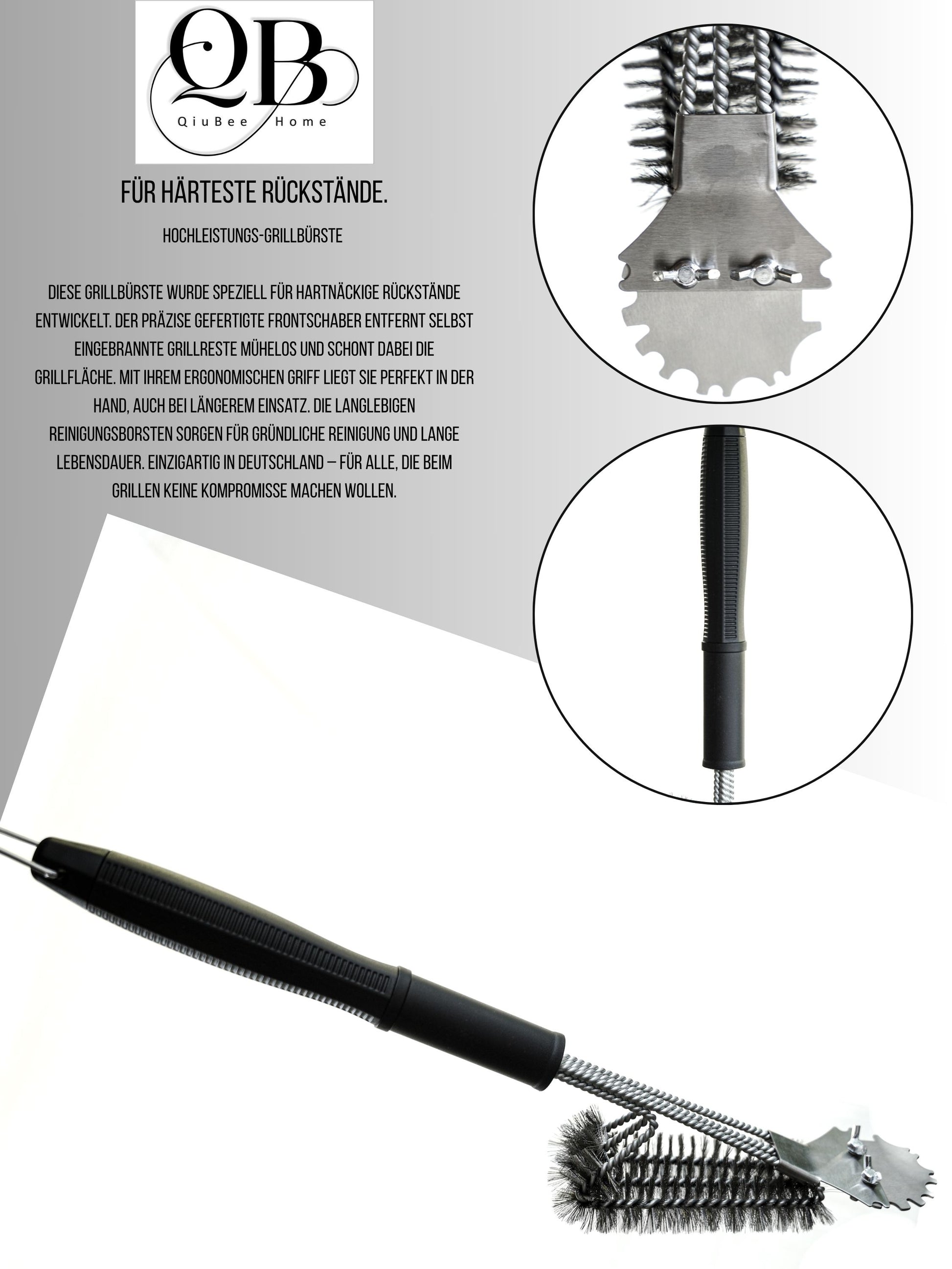- 3-IN-1 GRILLBÜRSTE MIT EDELSTAHL-SCHABER: Die QiuBeeHome Grillbürste kombiniert kräftige Edelstahlborsten mit einem integrierten Schaber – ideal zum Entfernen von eingebrannten Rückständen auf Gas-, Holzkohle-, Elektro- und Kugelgrills.
